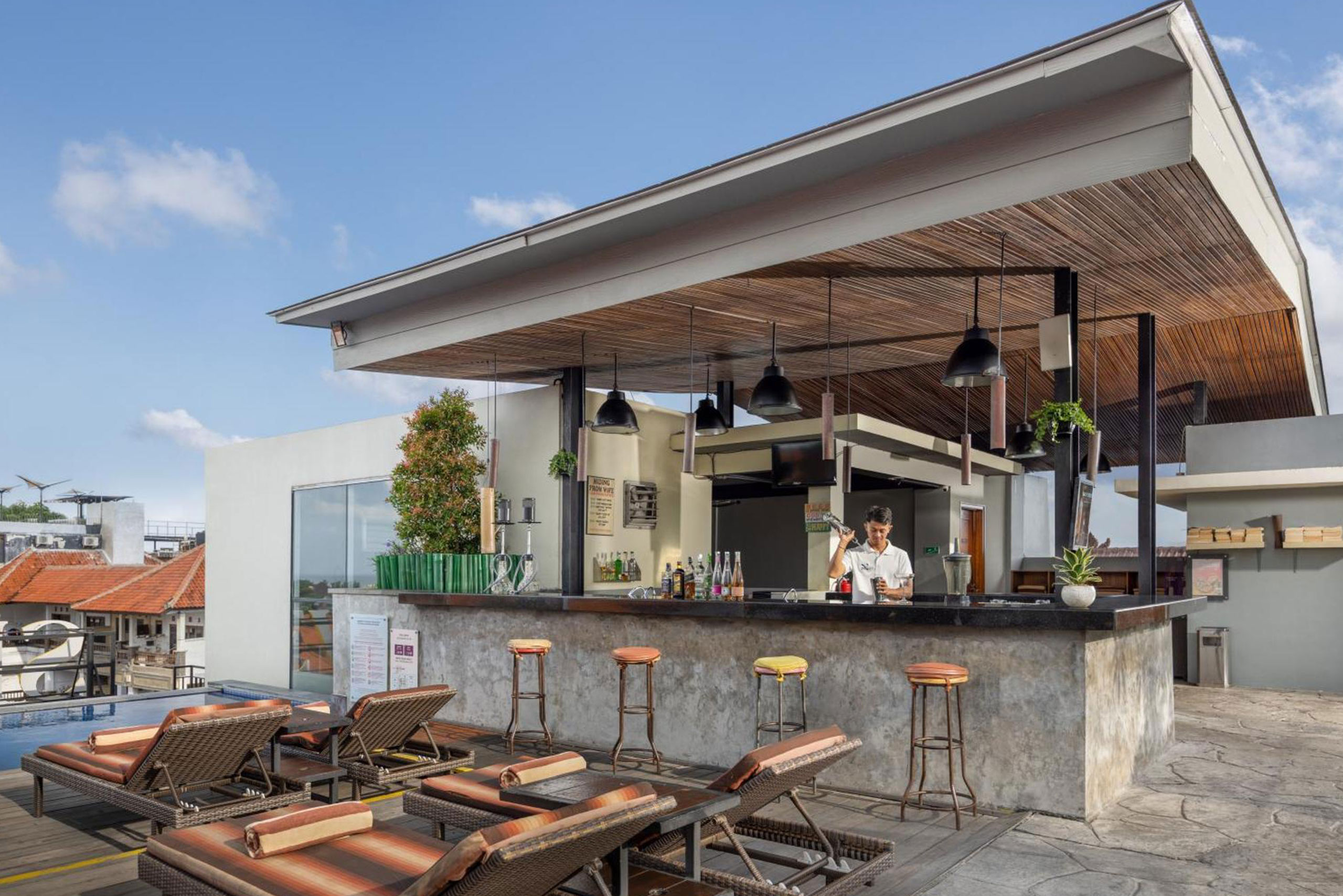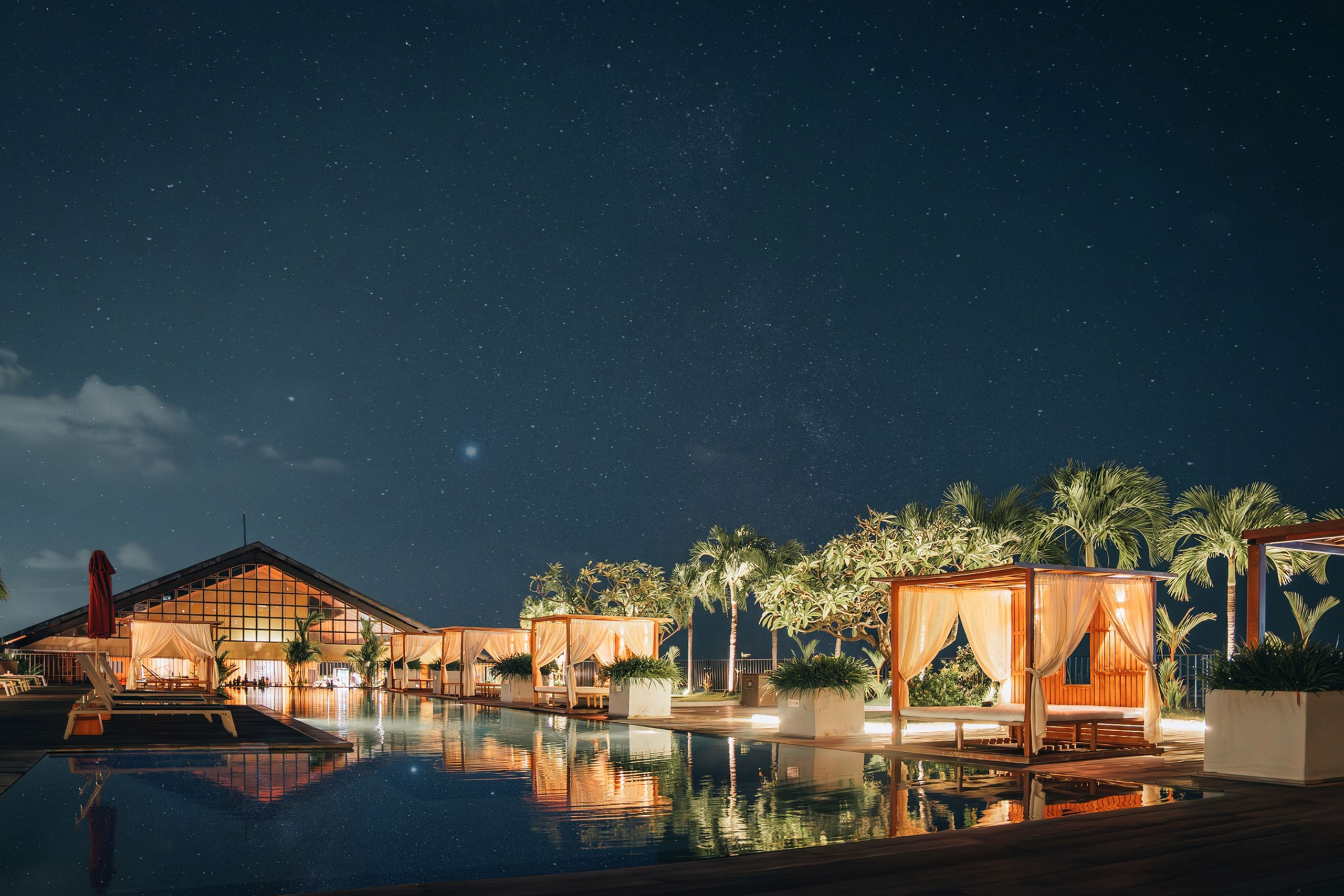 For a beachy, Canggu stay, LV8 comes loaded: daily breakfast, a daily cocktail, a daily set menu lunch or dinner, a one-time 60-minute massage, and access to Vue Beach Club plus Atlas Beach Club.