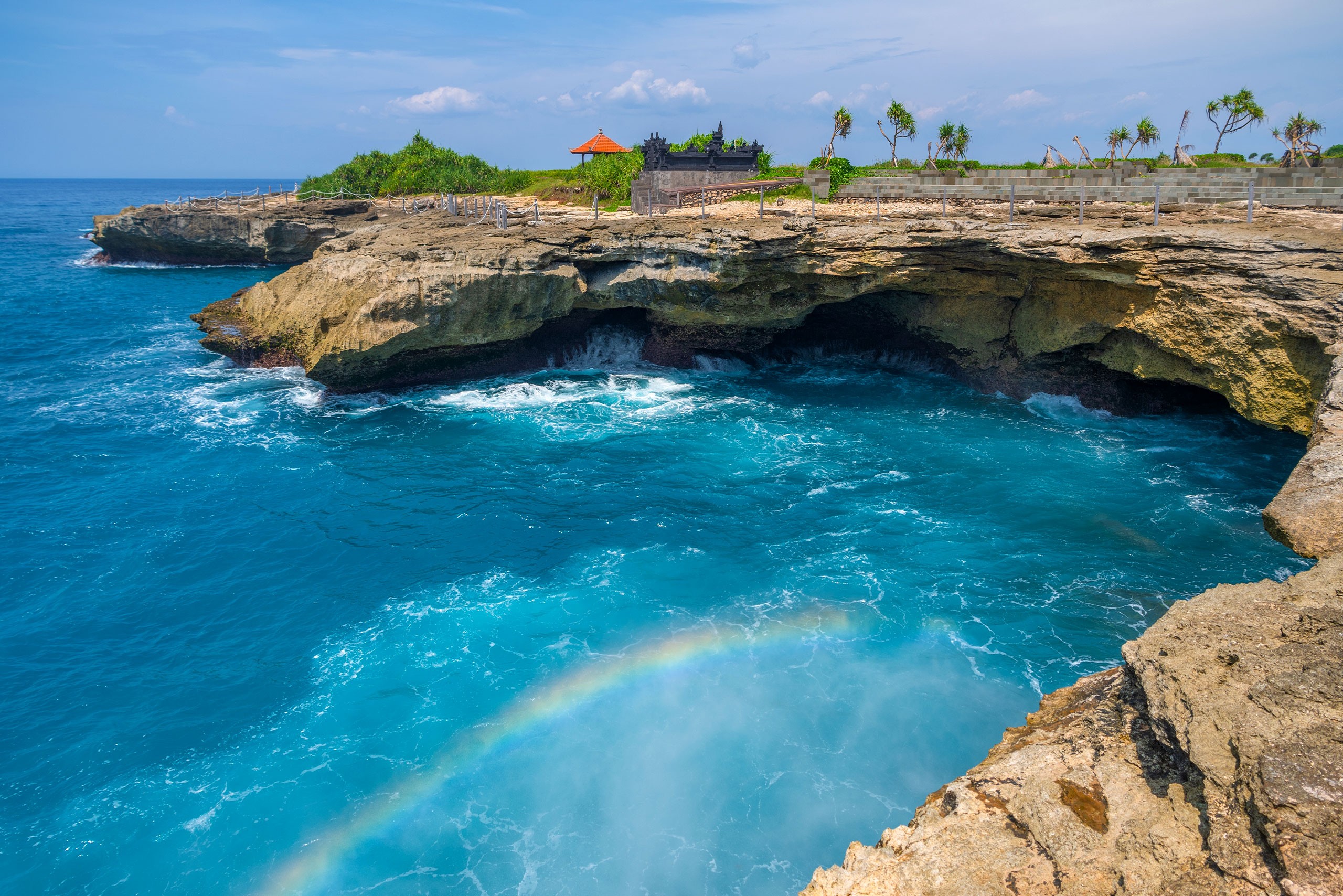 Perched on the rugged southwest coast of Nusa Lembongan, Devil’s Tears is a dramatic natural attraction where powerful Indian Ocean waves slam into the jagged limestone cliffs, shooting cascading sprays of seawater high into the air. It’s named for this explosive spray, resembling “tears”, and is widely recognised as one of the island’s most spectacular scenic viewpoints, especially around sunset when the golden light illuminates the crashing surf. Visitors can walk along the cliffside for panoramic ocean views and dramatic photo opportunities, though swimming here is unsafe due to the raw wave energy.