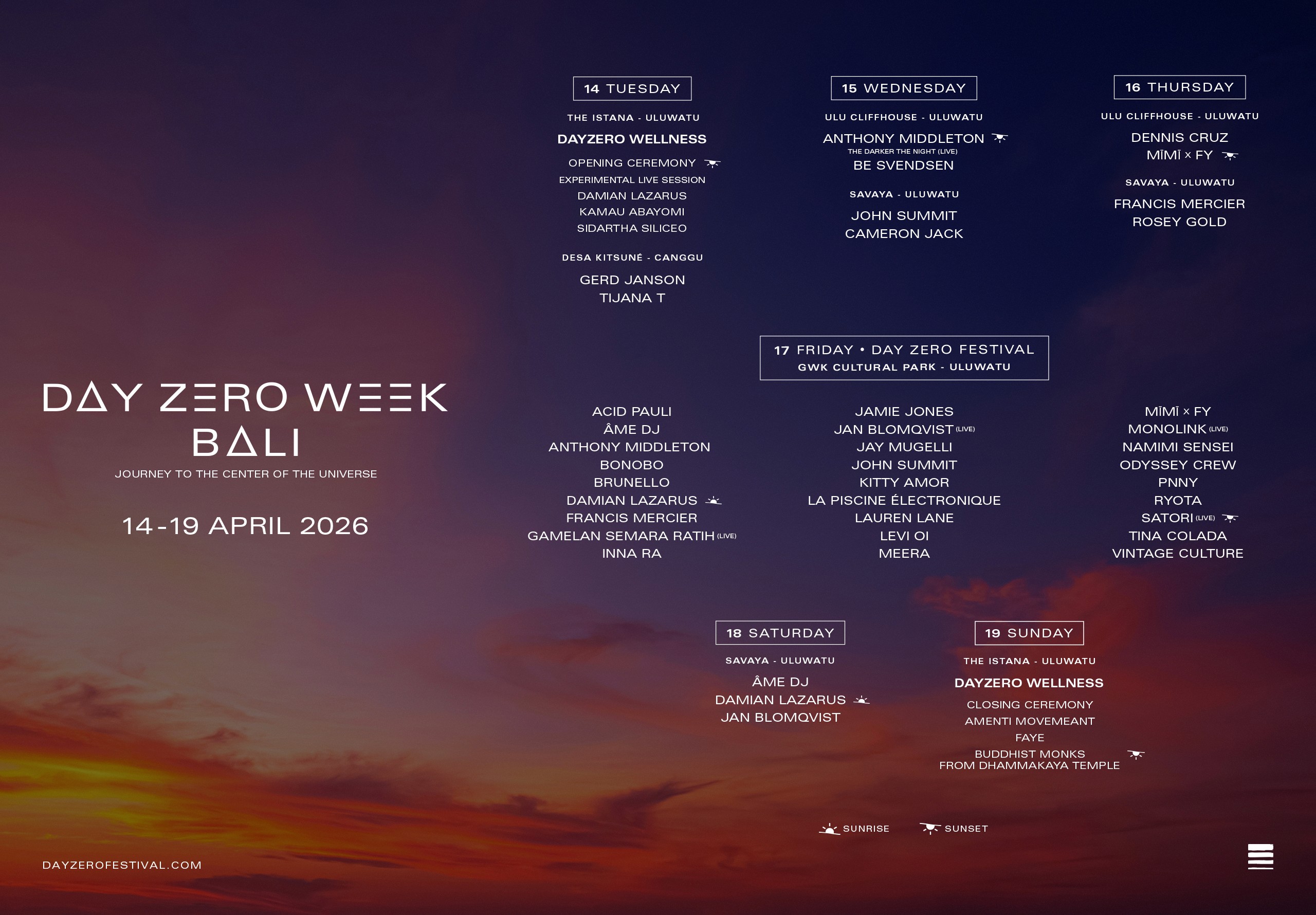 The Day Zero Bali 2026 lineup reflects Damian Lazarus’ signature curatorial style: genre-fluid, emotionally resonant and designed for long-form listening rather than quick hits.